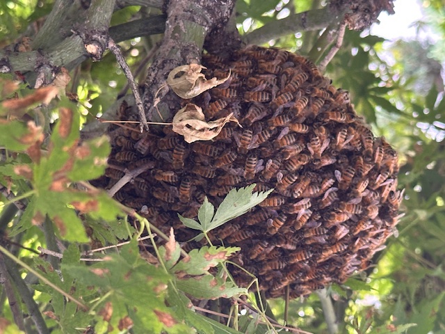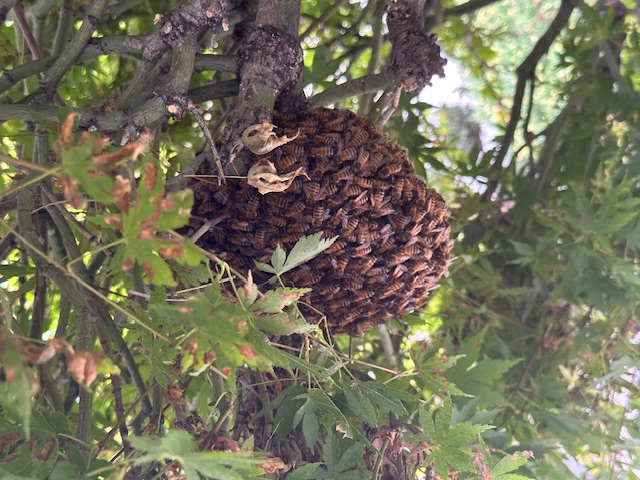 Caller says he thinks they’ve been there 2 weeks but photos don’t show any comb and cluster is small so maybe a new arrival landing where another swarm had been previously? 2 ft up in Japanese maple. Who can go?