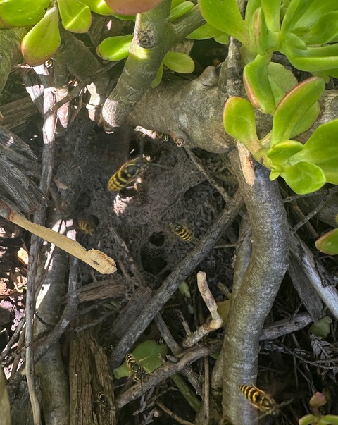 These are yellowjackets, as expected:I'm going to go back at sunset and kill them with a bucket of soapy water.On Aug 5, 2025, at 3:12 PM, Pamela Weimer via swarm-list <swarm-list [at] alamedabees.org> wrote:Caller is a resident nearby 585 Euclid and sent this photo. Property is owned by an elderly invalid named Greg and the caller, Chris, has promised to reach out to us for help.--Robert L Mathews