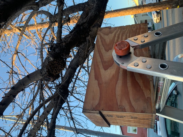 I caught a swarm this past Tuesday. It came from an open air hive in tree branches about 30 feet away. The small size makes it unlikely to survive through the balance of our cold period. They were gifted to Sister Barbara who will combine if queen less.