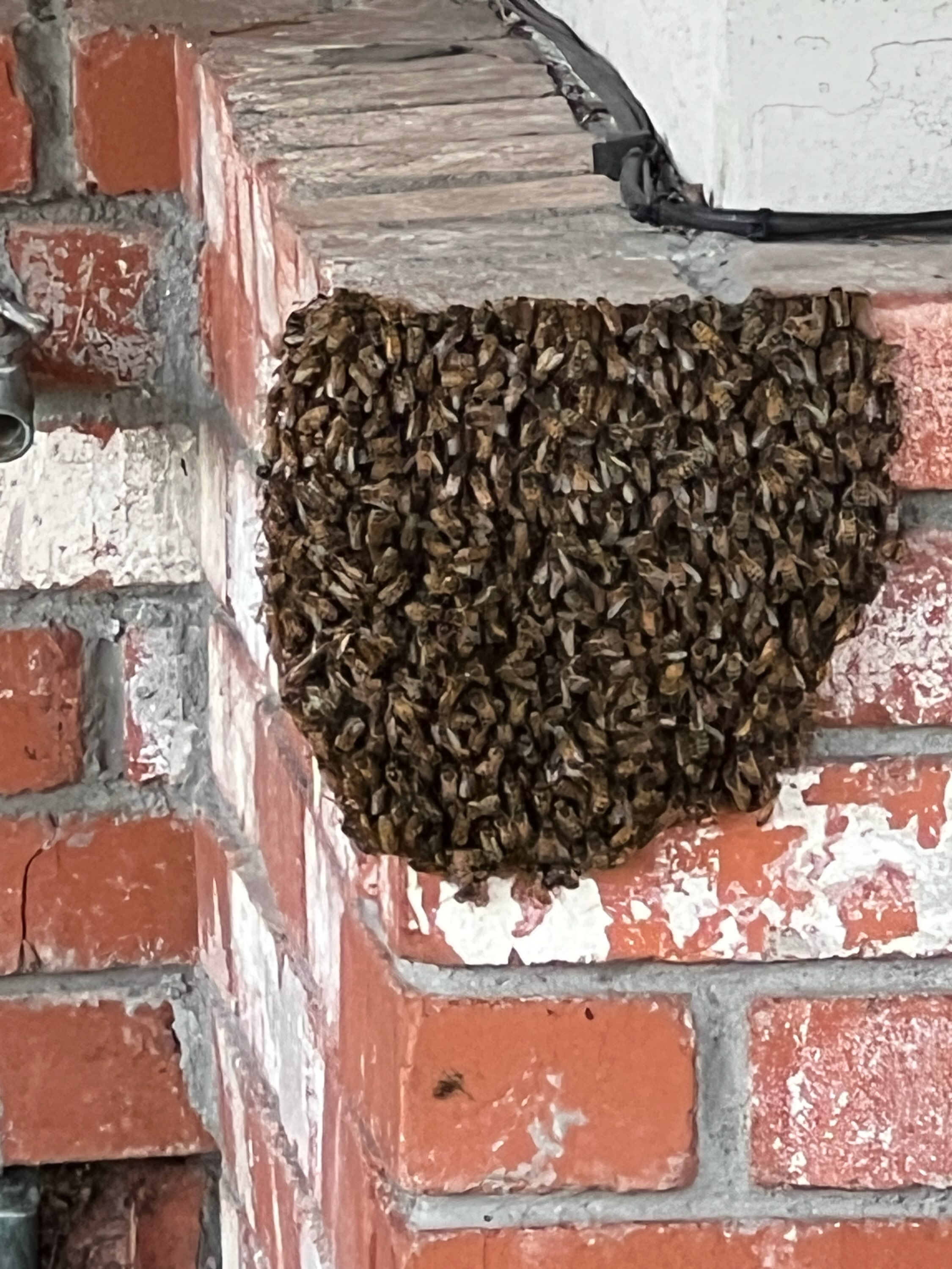 Wenshen noticed this adorable small cluster of bees on the brick face of her home at about knee height early today. She described it as "hand sized" but it seems maybe a little bigger? They don't appear to be moving in and haven't changed in size since she first noticed them much earlier today. Likely just a swarm hanging out and not moving inside the bricks. Who would like to collect these darlings first thing tomorrow?